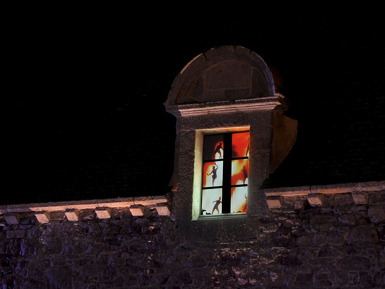 Durant les escales de nuit, les fenêtres de l'abbaye s'animent à leur tour de multiples projections vidéo pour découvrir les lieux d'un autre regard. S'y marient une pointe d'humour et l'insoutenable suspense, le temps de ce regard prolongé jusqu'à l'indiscrétion.