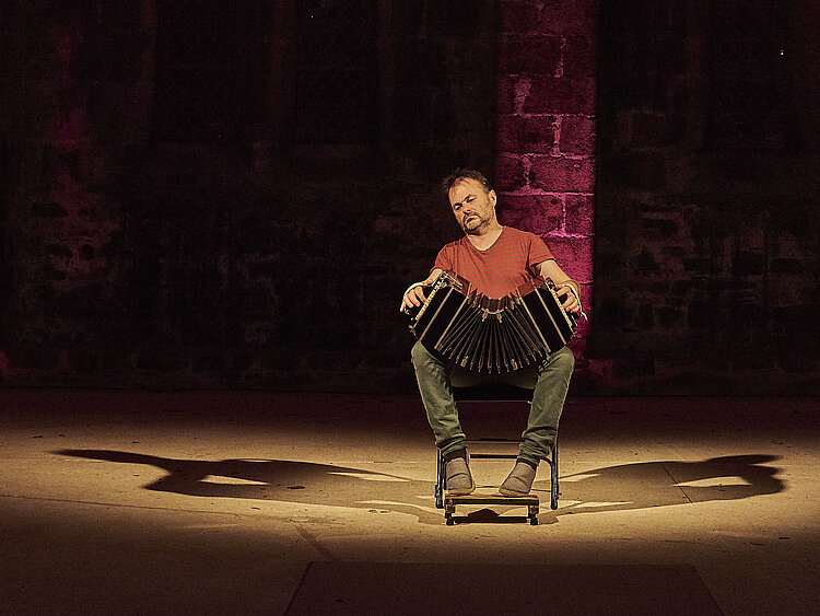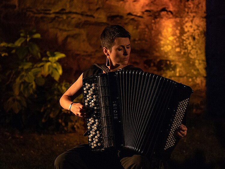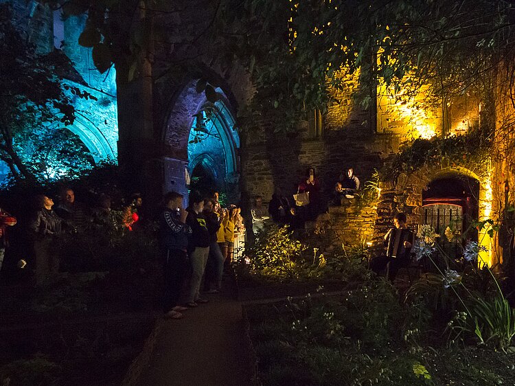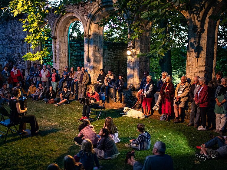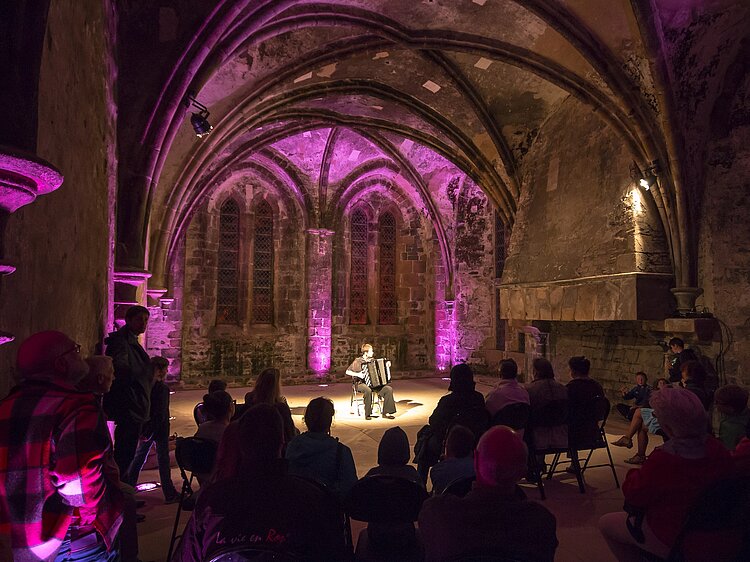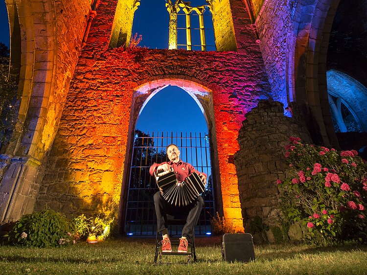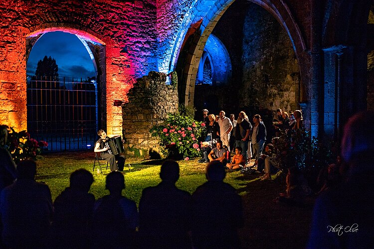 Les portes de l'abbaye s'ouvrent à 21h30, laissant le temps pour une balade entre chien et loup. Puis, à la tombée de la nuit, des lumières et de petites vidéos apparaissent et révèlent une abbaye pleine de surprises et de poésie. C'est le moment d'embarquer pour une flânerie nocturne au gré de la musique de l’accordéoniste Solène Normant et du bandonéoniste Philippe Ollivier.