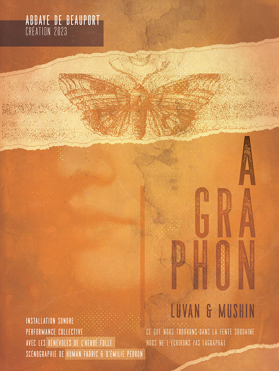 Invitation à l’écoute, à la contemplation, à la traversée, l’installation sonore "Agraphon", réalisée par Luvan & Floriane Pochon (concept et composition sonore), Terry Fairhead (Technicien son), Human Fabric (scénographie), Émilie Pedron (céramique) accompagnée de ses élèves et les bénévoles de l’Herbe Folle (voix et lecture), est une proposition d’incarnation totale.