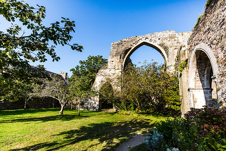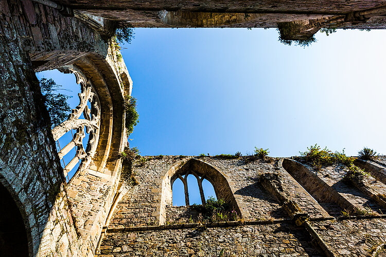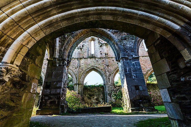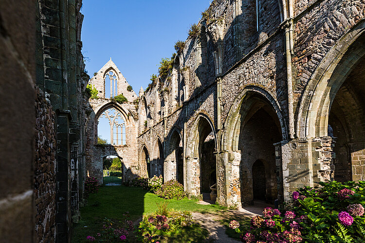 Mais c’était sans compter sur un couple particulièrement motivé : Mélanie Morand et Napoléon Poninski. Au milieu du 19è siècle, ils emménagent à Beauport sont tous les deux captivés par le Moyen Age et par les ruines, en vogue dans les milieux artistiques et littéraires romantiques d’alors. Cette ambiance est toujours là, dans l’église à ciel ouvert, où la végétation se mêle aux pierres. Peu à peu, les époux rachètent les différents bâtiments et réussissent même à faire classer Beauport au titre des Monuments Historiques dès 1862. Leurs tombes, réalisées à partir d’éléments sculptés du cloître médiéval sont aujourd’hui encore dans l’église.