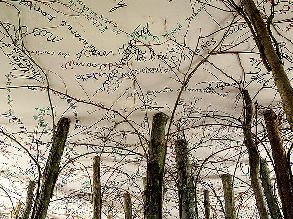 "Le bois des rencontrés" est une installation plastique créée en collaboration avec les personnes rencontrées dans le bois. Dans cette installation située au 33 rue de Beauport, les rencontrés ont reconstitué leur itinéraire et l'agrémentent d'éléments naturels glanés dans le bois.